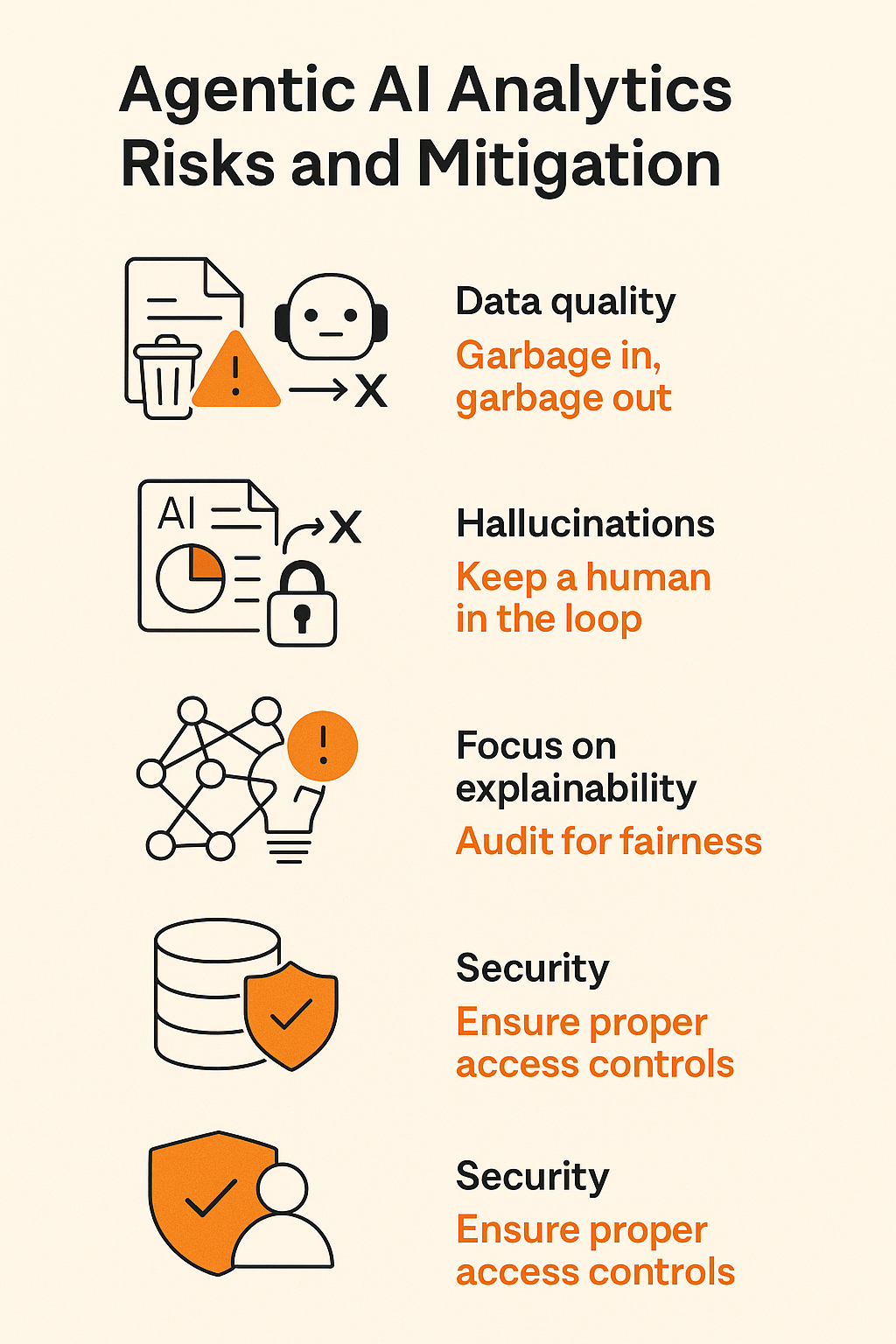 As with any powerful technology, there are risks and pitfalls to navigate. Here are some key risks in agentic analytics: and ways to mitigate them so you can reap the rewards safely: