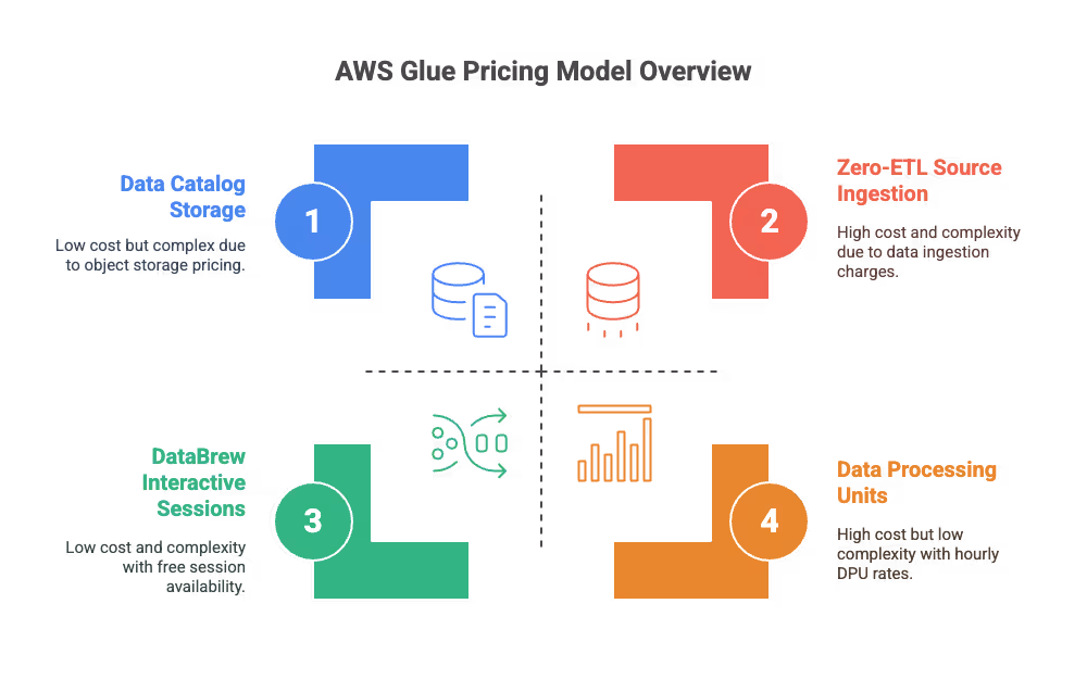 AWS Glue follows a pay-as-you-go pricing model with multiple components that can quickly add up. The service charges you only for the resources you actually use, but understanding these costs is crucial for budget planning.
