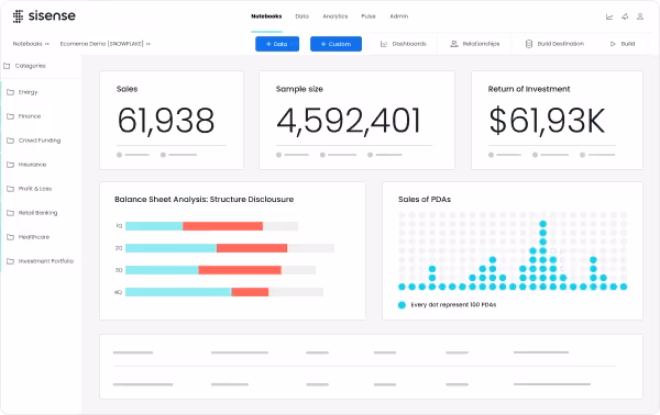 Sisense offers a complete BI solution, combining powerful analytics with an intuitive, user-friendly interface. This business intelligence software allows all your team members to manage, analyze, and visualize large and complex datasets without the involvement of your IT department.
