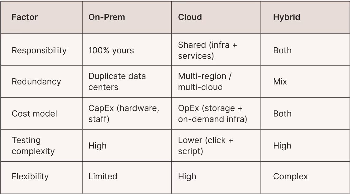 - Cloud vs. on-premises approaches differ in redundancy, cost, and responsibility; hybrid and multi-cloud setups improve resilience but add complexity