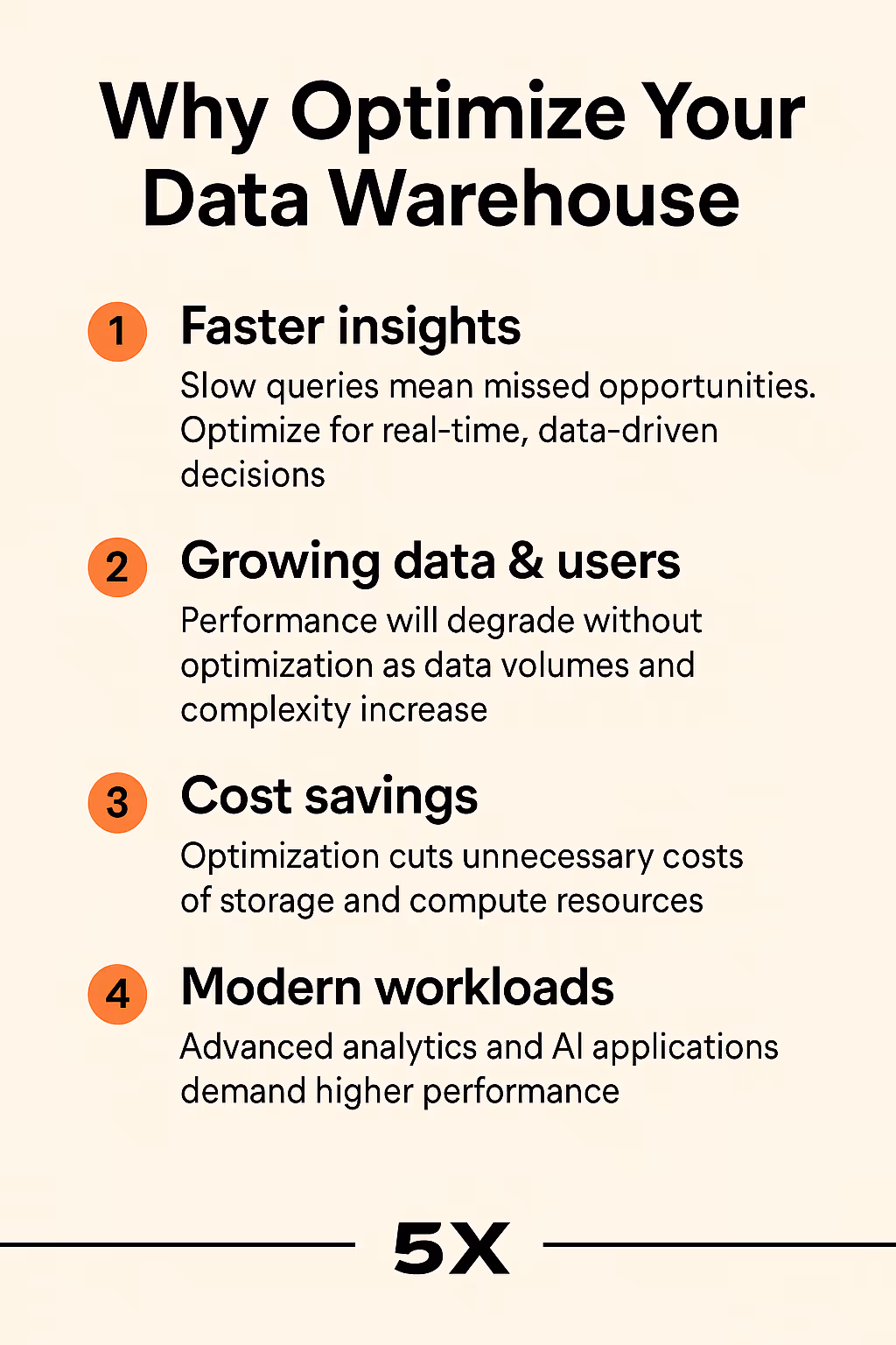 Without optimization, a warehouse can become a drag on your entire data analytics workflow. Here are the key reasons you should care about tuning your warehouse for performance and efficiency:
