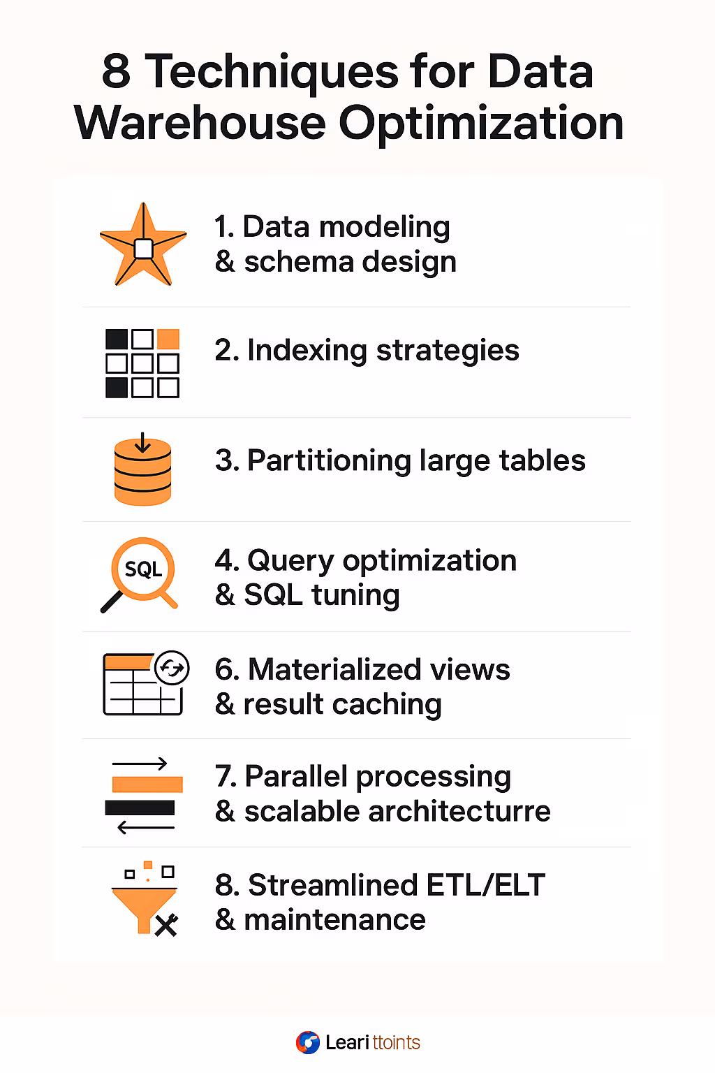 - Implement proven data warehouse optimization techniques like indexing crucial columns, partitioning large tables by date or category, compressing data, using query optimization (like rewriting SQL or leveraging materialized views), and adopting modern architectures (columnar storage, parallel processing, etc.)