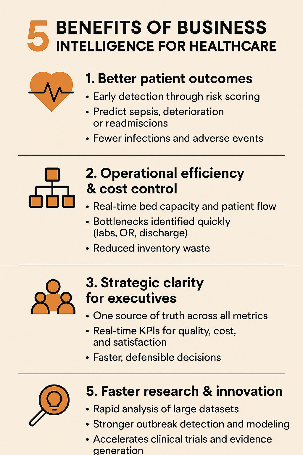 - BI creates a “single source of truth” across clinical, financial, and operational metrics