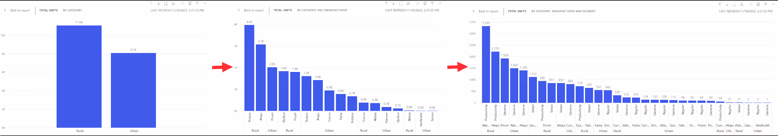 For business users, they can check the details behind the rolled-up data by drilling all the way to the specific transaction or item.