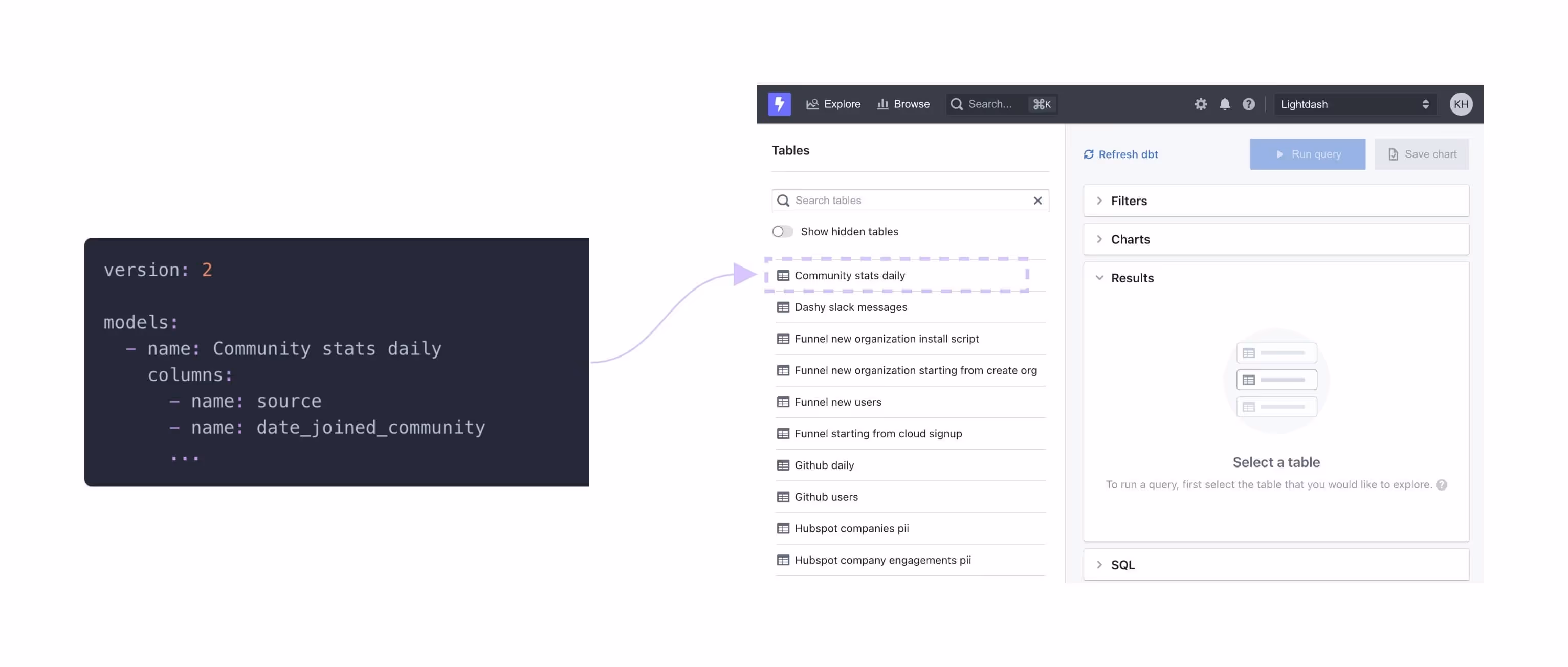 In Lightdash, everything you need for BI is written as code in your dbt project. You can use dbt to transform all of the data from your data warehouse, then use Lightdash to explore the data. To get a model in dbt Lightdash-ready, you need to define all of the columns that you want to explore in Lightdash and then test them out in a Lightdash preview environment.